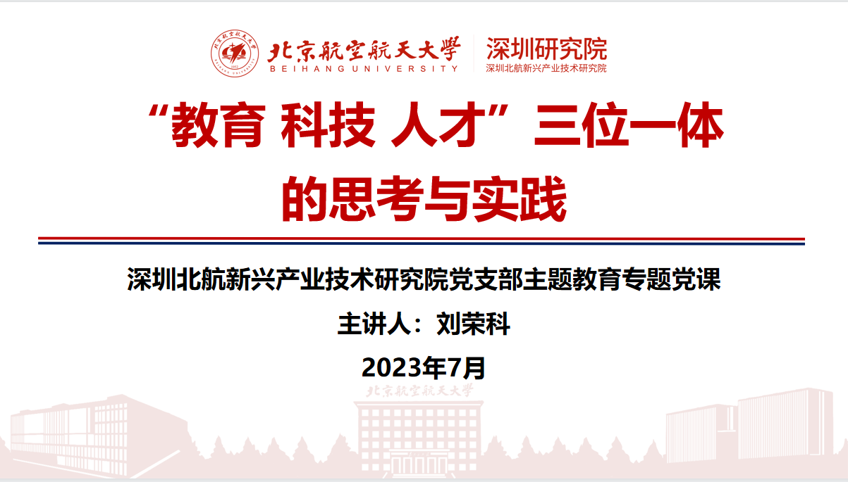 刘院长以“‘教育-科技-人才’三位一体的思考与实践”为题,围绕习近平总书记有关重要论述和讲话精神,分享了对于教育、科技和人才“三位一体”的理解,讲述了北京航空航天大学教育、科技和人才方面的重要实践,并结合实际情况阐述了研究院在推动“三位一体”发展中的思考和实践。同时,他还强调了研究院在推动“三位一体”发展中所面临的挑战和困难,并提出了相应的对策和建议。