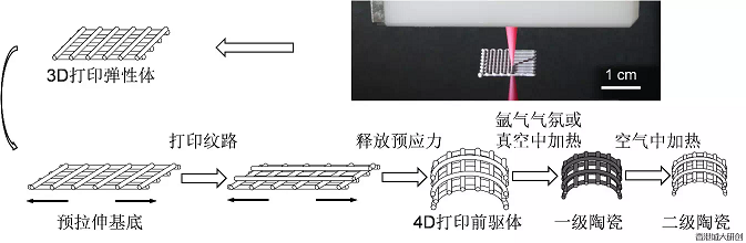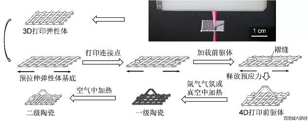在这项研究中,团队利用拉伸了的前驱体的弹性势能来变形。当拉伸的陶瓷前驱体弹性能量被释放时,它会进行自我变形。经过热处理后,前驱体就会转化成陶瓷。