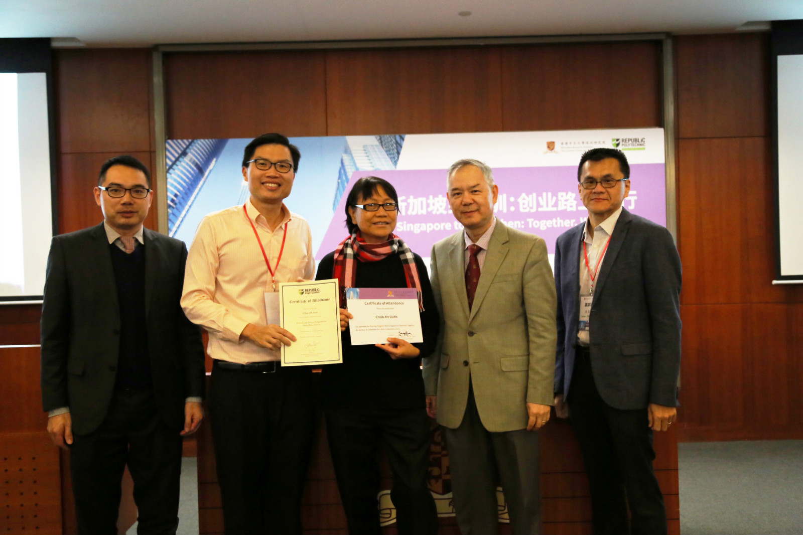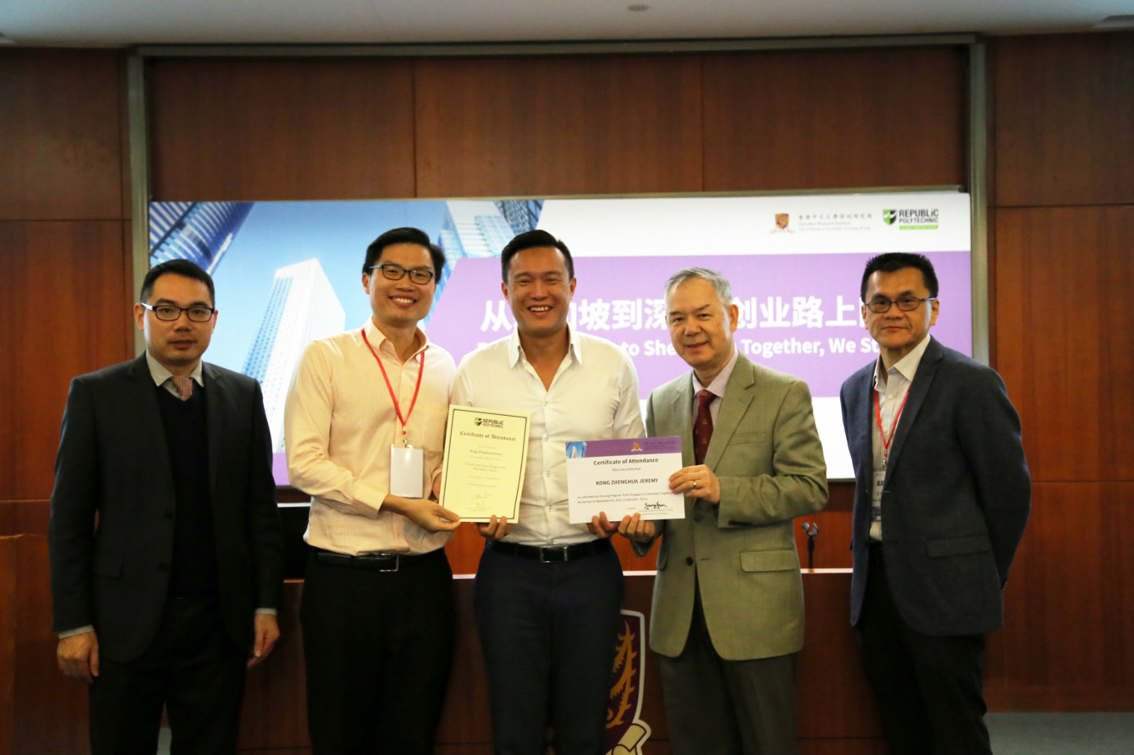 活动尾声,由香港中文大学深圳研究院领导和新加坡共和理工学院领导共同为创业者颁发了证书,祝贺所有参与者在活动期间的投入与付出,希望在未来有更多创业者能落地深圳。