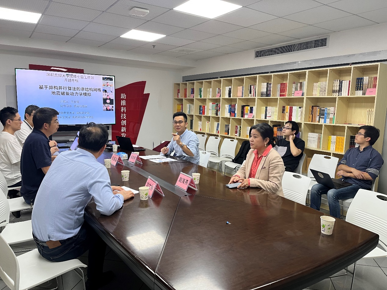 王文强博士,博士由哈尔滨工业大学和南方科技大学联合培养,今年9月加入杨宏峰教授团队并就职于香港中文大学深圳研究院,开展博士后研究工作。会上,王文强博士进行题为《基于异构并行算法的三维非结构网格地震破裂动力学模拟》的报告。课题主要目标是借助异构计算技术,开发高效的非结构网格破裂动力学模拟并行算法,充分考虑断层、地形及介质等地质环境的复杂性,实现更贴近真实地震的破裂过程的快速模拟,以研究复杂断层破裂的物理过程及地震造成的地表破坏,为相关部门抗震设防、应急救援提供科学建议和指导。
