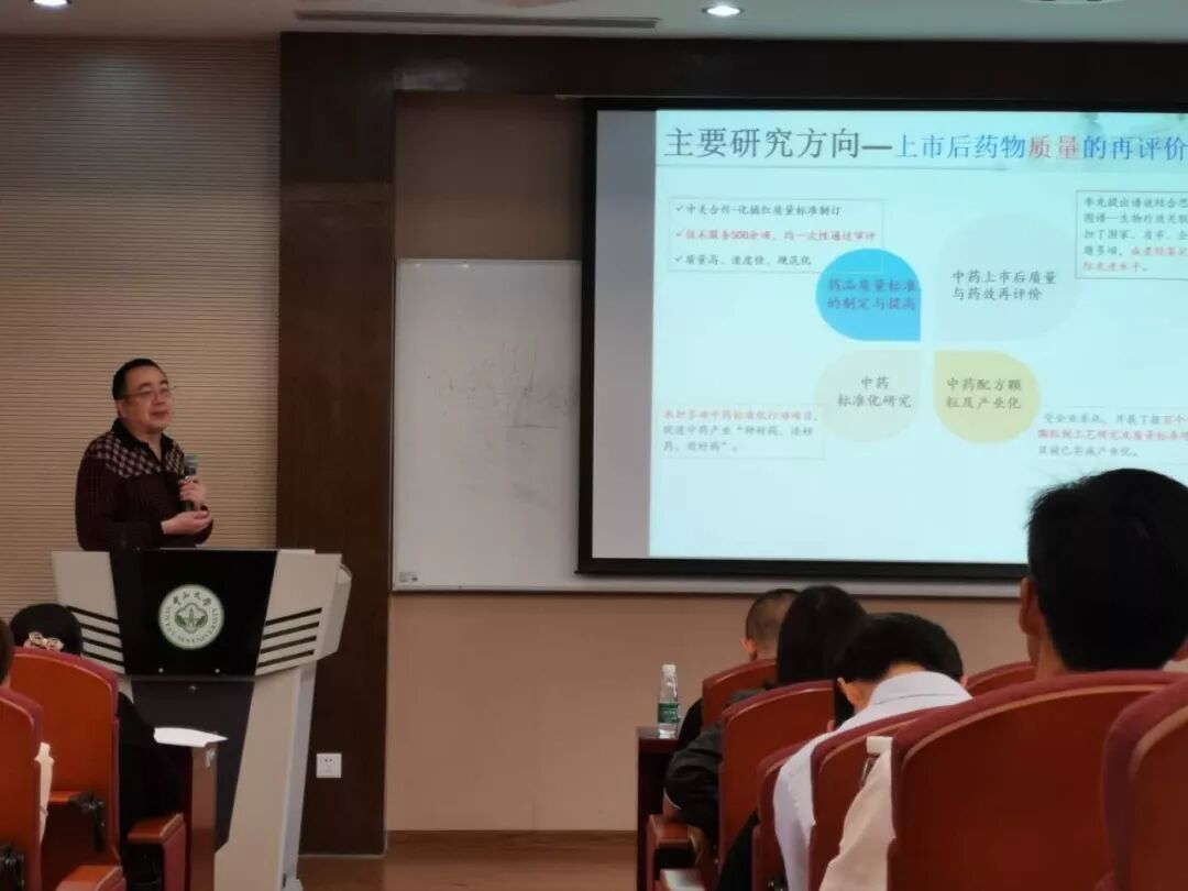 吴教授为大家介绍了实验室以中成药大品种为研究对象,采用国际先进的现代生物学技术与手段,结合中国传统医学与药学特点,开展中成药大品种的现代评价。主要解决中药复方制剂到底是否有效?药效特点如何?到底含有那些化学成分?那么多化学成分中找到哪些成分对药效及安全性起主要作用——即药效物质基础是什么?中药的作用机制及靶点如何?中药组方的科学依据如何?全面揭示中药大品种的科学内涵,为临床合理用药服务。