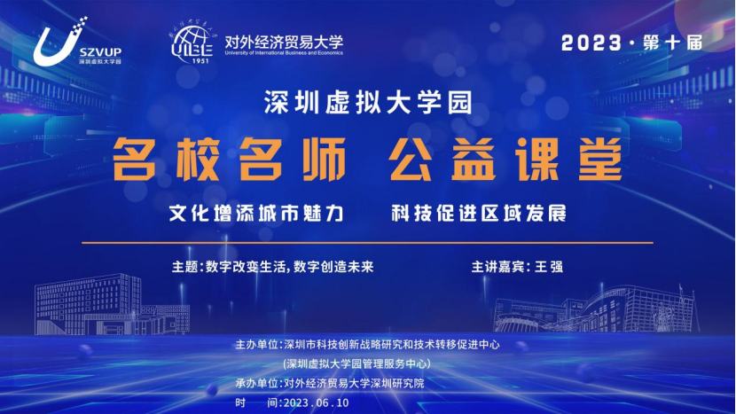 2023年6月10日下午,深圳虚拟大学园第十届名校名师公益课堂第二讲在深圳虚拟大学园重点实验室平台大楼举行,对外经济贸易大学王强副校长作了题为《数字改变生活,数字创造未来》的讲座,分享数字经济发展的现状与趋势。
