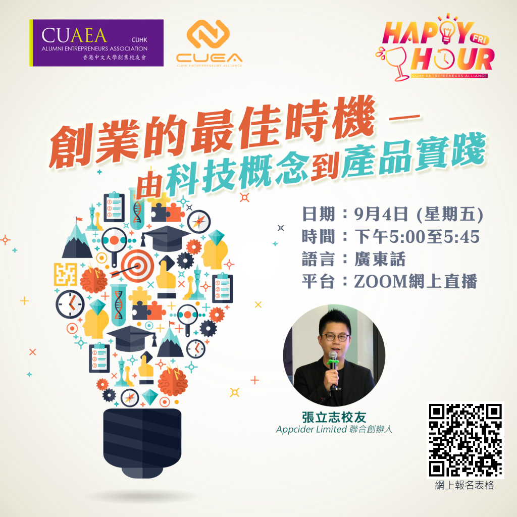 「Happy Hour」创业访谈系列第七回,由香港中文大学创业校友会(CUAEA)主办。Appcider及其联合创办人张立志(Taurus Cheung)一直支持香港的科创生态发展。这次得到CUAEA邀请,分享创业的最佳时机,由构思、产品转型、危机处理等经验及技巧,如何做到科技概念到产品实践的实战分享。适合有意创业、刚开始创业及在创业上遇到瓶颈的朋友一起互动交流。