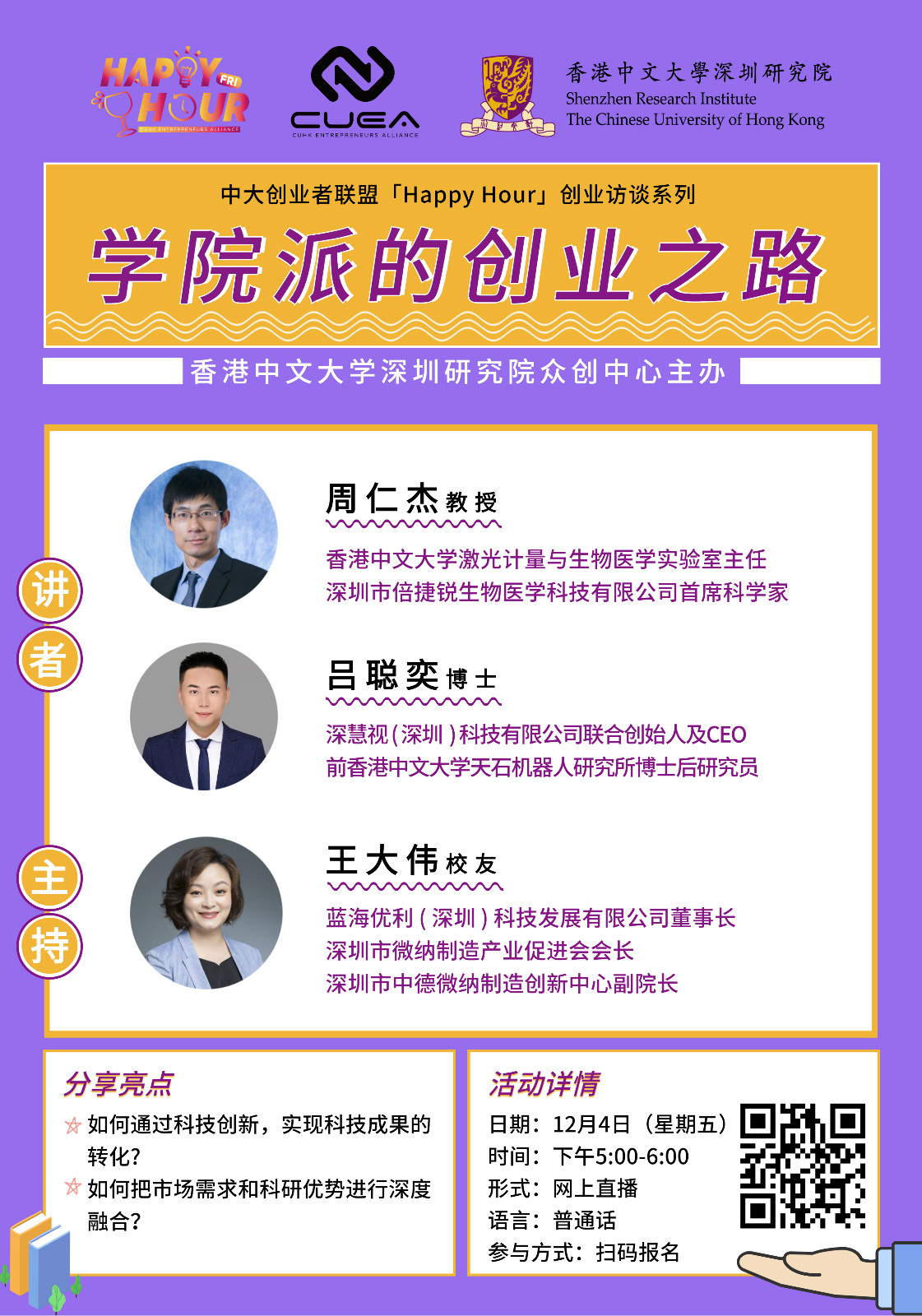 香港中文大学作为全港最具创新力的大学之一,既拥有雄厚的科研实力,亦鼓励科研人员通过科技创新,以将学校的科研成果转化,推动知识型创新科技的发展。科研人员最大的优势是擅长用科学的方法去分析和解决各类问题,但如果想要创业则需要具备把市场需求和科研优势进行深度融合的能力。香港中文大学深圳研究院众创中心已经汇聚了大批学院派的教授、校友和学生创业者,他们是如何做到这两方面的平衡,实现科技成果的转化,并解决了市场的难点。让我们一起走进「Happy Hour」第二轮创业访谈系列第八回线上活动,听听他们浅谈学院派的创业之路。