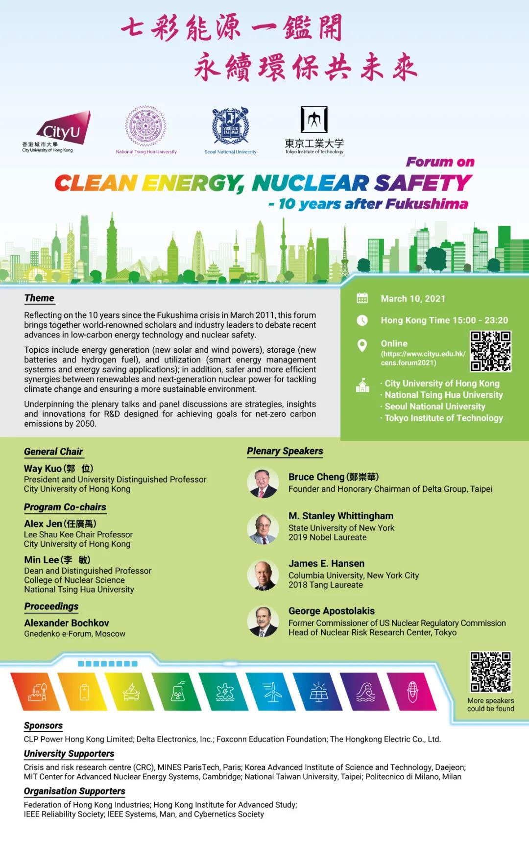 香港城市大学现与台湾清华大学、首尔大学及东京工业大学于2021年3月10日,联合举办网上论坛 “七彩能源一鉴开,永续环保共未来( Clean Energy and Nuclear Safety – 10 years after Fukushima)”。此次论坛由香港城市大学校长郭位教授致开幕词,并介绍“七彩能源”的概念。