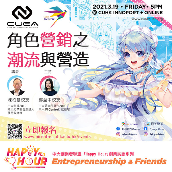「Happy Hour」创业访谈系列第三轮首期活动由香港中文大学前期创业育成中心(PI Centre)主办。活动采用线上直播和现场参与两种方式。透过「角色营销」,飞天奶茶成功在不足一年的时间内累积两万名活跃用户以及超过七百万次网站浏览量,更为来自日本、台湾与香港的多家企业设计「角色营销」的宣传企划并获得了优异的成效。新创企业可以如何快速吸引客户?究竟什么是「角色营销」?飞天奶茶为香港中文大学PI Centre的毕业队伍,亦为港中大校长杯2020冠军及港中大创业大赛2020季军,今年即将在台湾开设分公司。他们是如何在大学毕业后的一年内做到这一切?