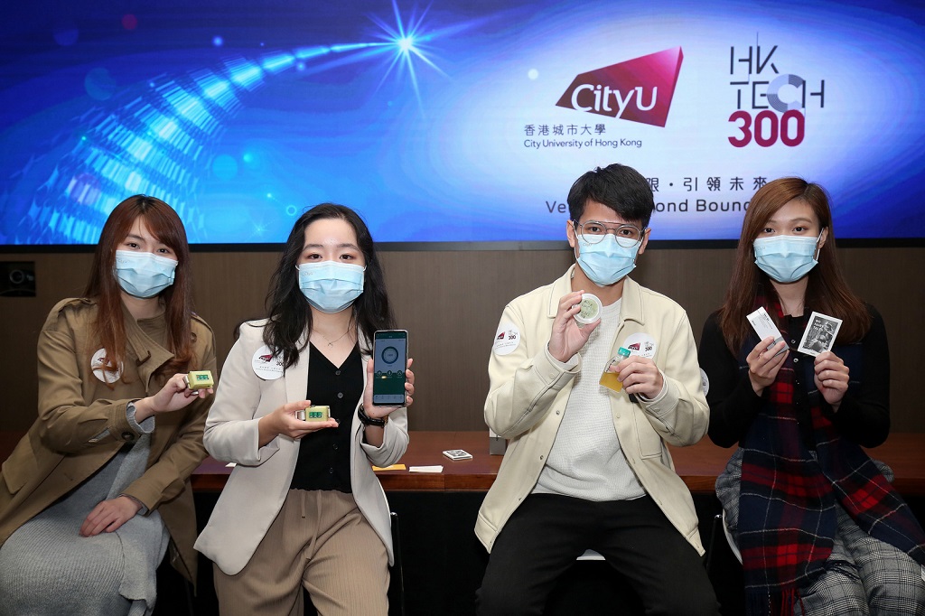 出身于香港城大的谢文蔚(左一)与颜炜彤(左二)创立了里索科技,研发供轻度和中度听障人士适用的手环;而苏乐文(右二)及谢敏铃(右一)则有份创立联手生命科技有限公司,设立以科学实证为基础的香港护肤品牌。他们联同其他香港城大初创企业的代表,于“HK Tech 300”启动礼后向一众嘉宾介绍他们的初创企业情况及产品。