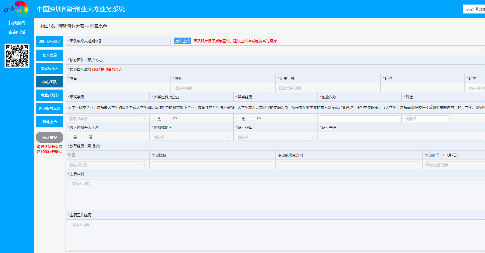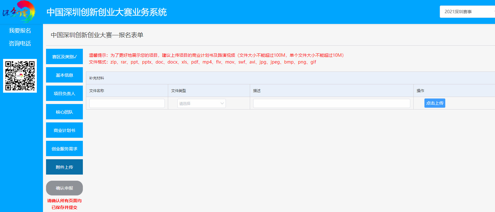按报名表单页面左侧的模块,根据要求逐一填报内容、上传附件。