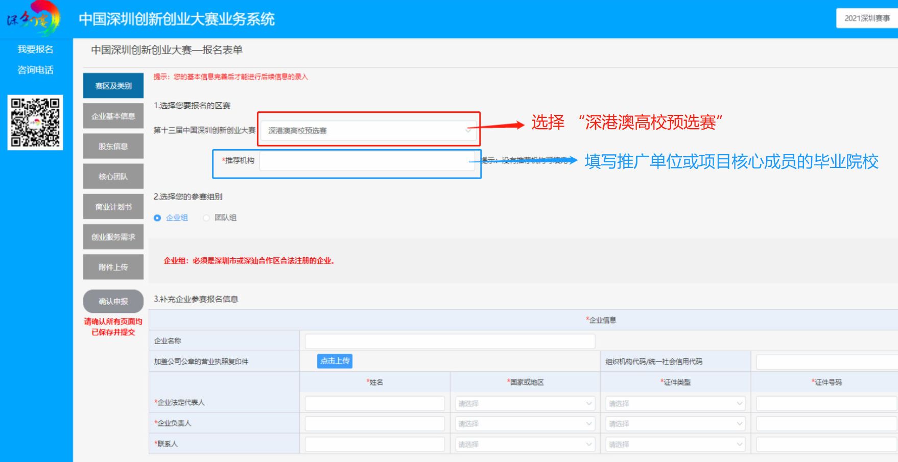 进入大赛报名表单,选择“深港澳高校预选赛”和参赛组别,并在【推荐机构】处填写推广单位或核心成员的毕业院校。