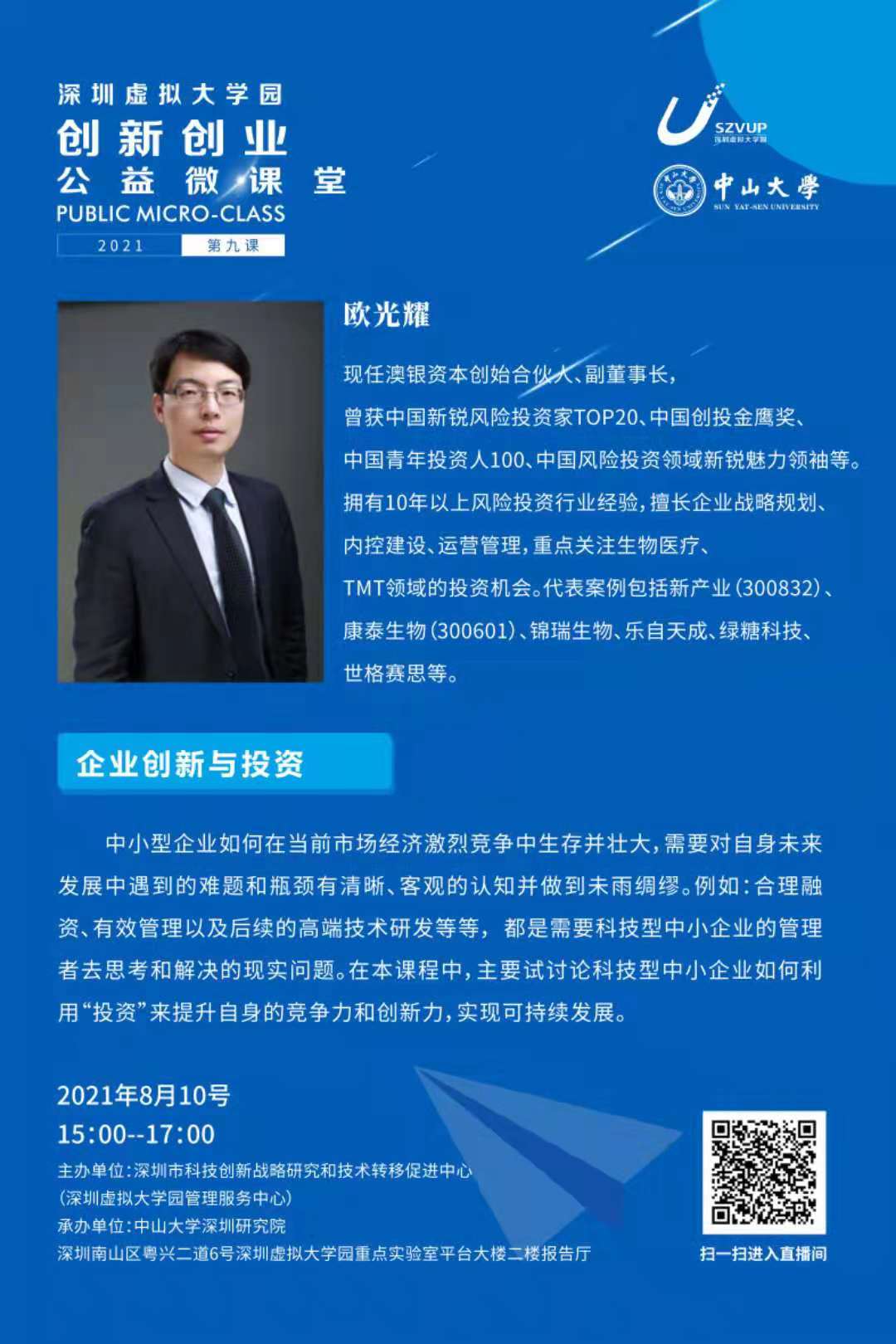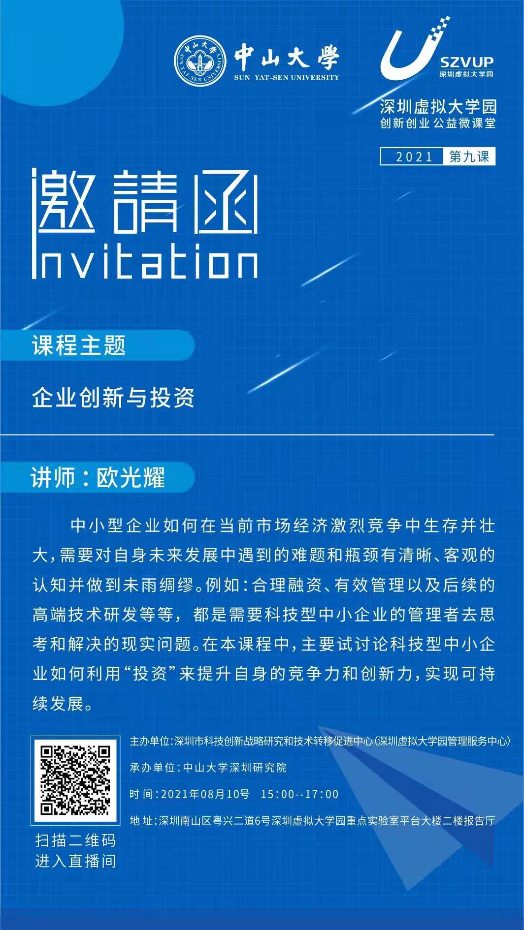 讲座预告 | 创新创业公益微课堂第九讲【企业创新与投资】