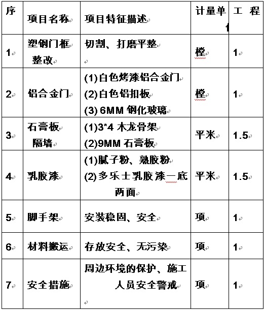 2、材质要求:各成品材质必须符合设计要求;施工应在适宜的气候温度下进行,铝合金门安装时应用水平仪测量标准,接缝处的玻璃胶需美观;包空调管的隔板须安装牢固,外面乳胶漆需平整、均匀;玻璃的颜色、厚度须与原材质相符。