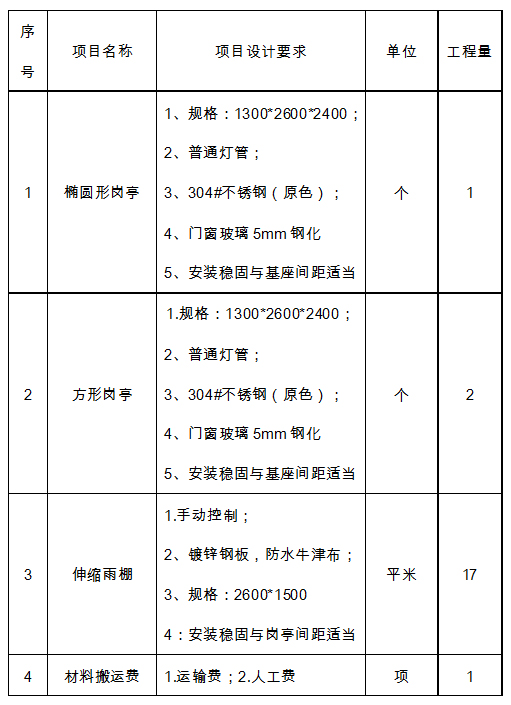 详见附件:岗亭伸缩雨棚制作安装的规格及技术要求。