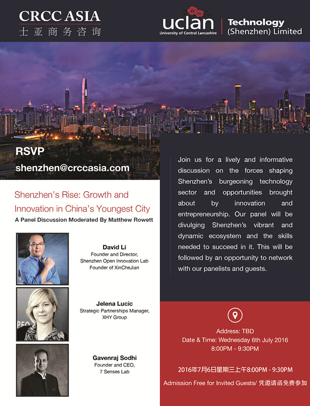 兰开夏科技(深圳)有限公司将与士亚商务咨询有限公司(CRCC ASIA)针对在深海外留学生举行一场关于中国深圳创新创业发展的公益论坛。