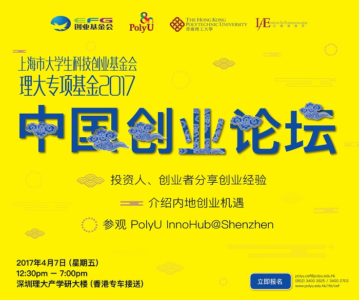 为推动沪、港、深三地之创业文化,香港理工大学及上海市大学生科技创业基金会特别举办「中国创业论坛」,邀请知名创业家、投资者、创业孵化机构代表等,让有志在中国创业的人士可与嘉宾互相交流,并了解中国的创业环境。