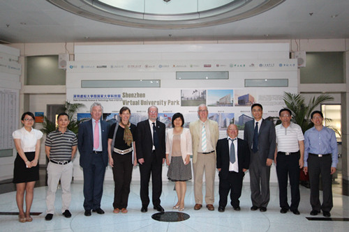 (深圳虚拟大学园管理服务中心  戎雪亚、张娅)6月26日,苏格兰拨款委员会科研和知识交流委员会主席、阿伯丁大学副校长 Albert Rodger教授、苏格兰大学生命科学联盟执行理事Denise Barrault博士、爱丁堡大学分子寄生虫学David Arnot教授、苏格兰国际发展局(香港)经理Fiona Squair女士以及英国文化协会驻香港和广州两地官员一行11人组成的代表团到访深圳虚拟大学园。