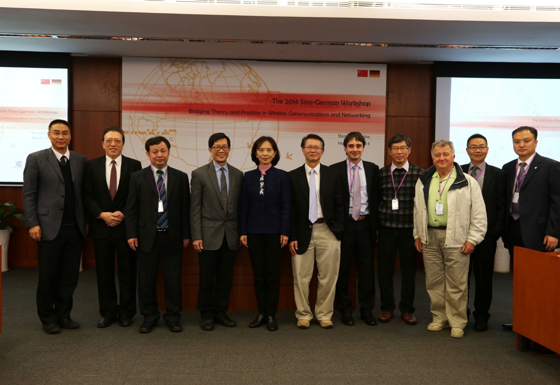 2014年3月4日上午,中德“无线通信与网络架构•理论与实践的结合”双边研讨会在香港中文大学深圳研究院开幕,中德科学中心常务副主任陈乐生教授、德国航天局(DLR)Gianluigi Liva博士(研讨会德方主席)、深圳市科技创新委员会王立新处长、香港中文大学副校长程伯中教授、香港中文大学李硕彦教授、杨伟豪教授、刘绍强教授(研讨会中方主席)、香港中文大学深圳研究院常务副院长梁斌教授等嘉宾出席了开幕式。