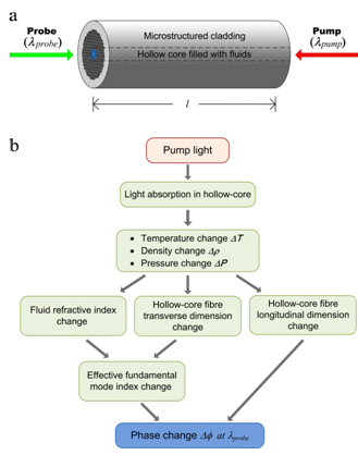 痕量气体探测在环境、医疗、安防等领域具有重要应用。基于光纤的气体探测能够实现小型化、多点复用、组网及远程监测,是近年来光纤传感的前沿研究领域。然而,传统的吸收型光纤气体传感器由于光与物质作用效率不高,背景及模式噪声大,其传感灵敏度很难突破1ppm,动态范围一般限制在3个数量级左右。