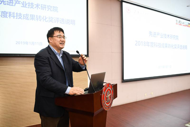 产研院院长刘燕刚总结了2018年度学校科技成果转移转化总体情况。产研院积极推动学校成果转化工作,完善体制机制建设,探索多元化的成果转化创新模式。未来,产研院要做机制体制创新的领跑者、技术转移人才培育的基地、科技服务社会的高地、特色模式的样板。