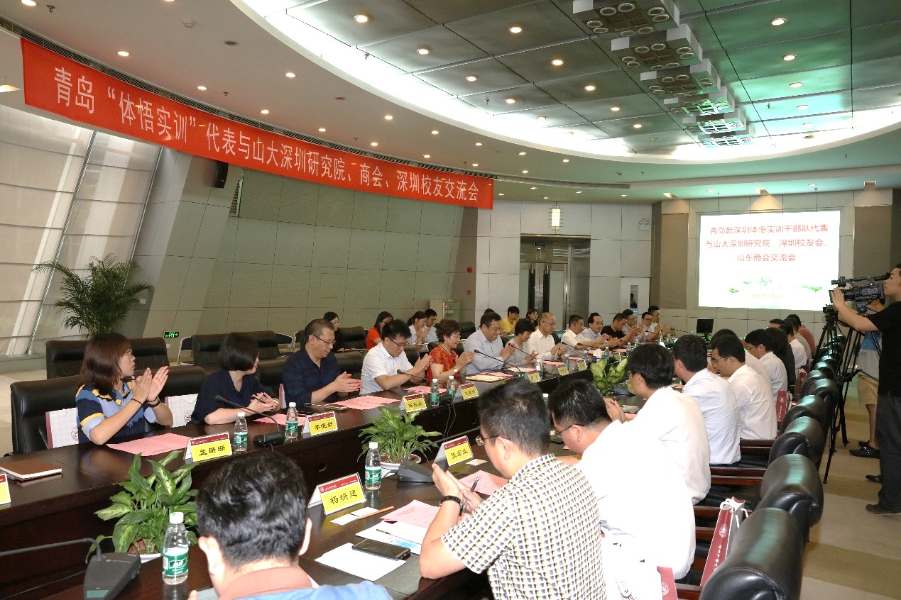 7月3日,青岛赴深圳体悟实训干部队代表与山东大学深圳研究院、深圳校友会、山东商会交流会在深圳虚拟大学园隆重举行。深圳市科技创新战略研究中心协调部部长陈蓉,青岛市工信局副局长秦青松,山东大学深圳研究院常务副院长兼合作发展部副部长王明星,深圳市东华集团董事长、总经理、深圳市山东商会会长、山大深圳校友会常务副会长王立新,山东大学服务山东办公室副主任、经济学院副院长石绍宾出席会议。会议由山东大学深圳研究院副院长、深圳校友会副会长傅杰主持。