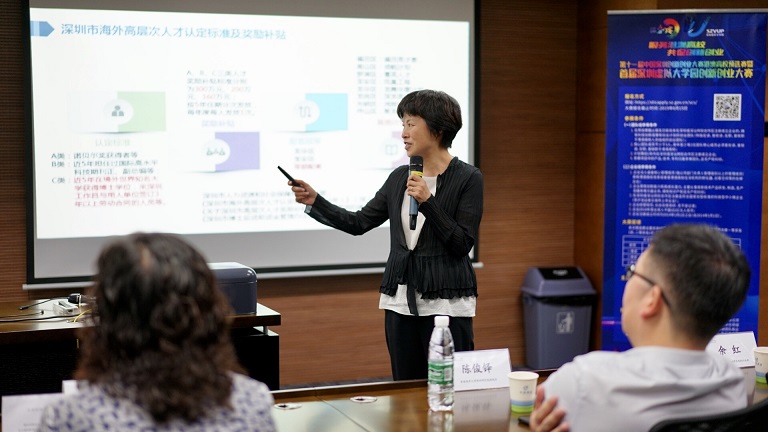 深圳市科技创新战略研究中心陈蓉部长对于深创赛的政策支持进行了专业全面地讲解。主要从海外高层次人才的认定标准及奖励补贴、深圳市创业资助、深圳市技术转移和成果转化资助、企业研究开发资助及高企培育等四类政策支持,进行了详细讲解。深创赛作为获取以上政府政策的唯一渠道,是推动创新创业的强劲动力,也是对高校创业群体强有力的支撑。