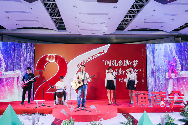 当天晚上,深圳虚拟大学园组织了以“同筑创新梦,抒写新篇章——时光巡礼”为主题的成立20周年诵读会。人大深圳校友艺术团七位校友代表母校参加演出,参演曲目《旧时光·小模样》由2001级法学院罗柳斌校友作词作曲,是一首充满青春气息的校园歌曲,彰显了人大人为追逐梦想而坚持努力奋斗的精神。校友们的精彩演出得到了全场观众的热烈掌声。