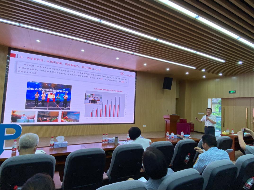 文化交流方面,研究院累计举办《山大深圳齐鲁大讲堂》三十余场,助推深圳市民大讲堂和虚拟大学园公益课堂,提升城市整体文化素质和创新驱动能力;积极传播山大文化,本科生招生拓展实现了3个互动,2019年全日制本科在粤录取线突破新高,理科录取线高于当地一本线86分,文科51分,生源质量显著改善;支持大学园成立20周年庆祝活动,全体工作人员编制节目《雕刻时光》,参加诗歌诵读会,反响热烈,节目纳入深圳读书月活动内容。