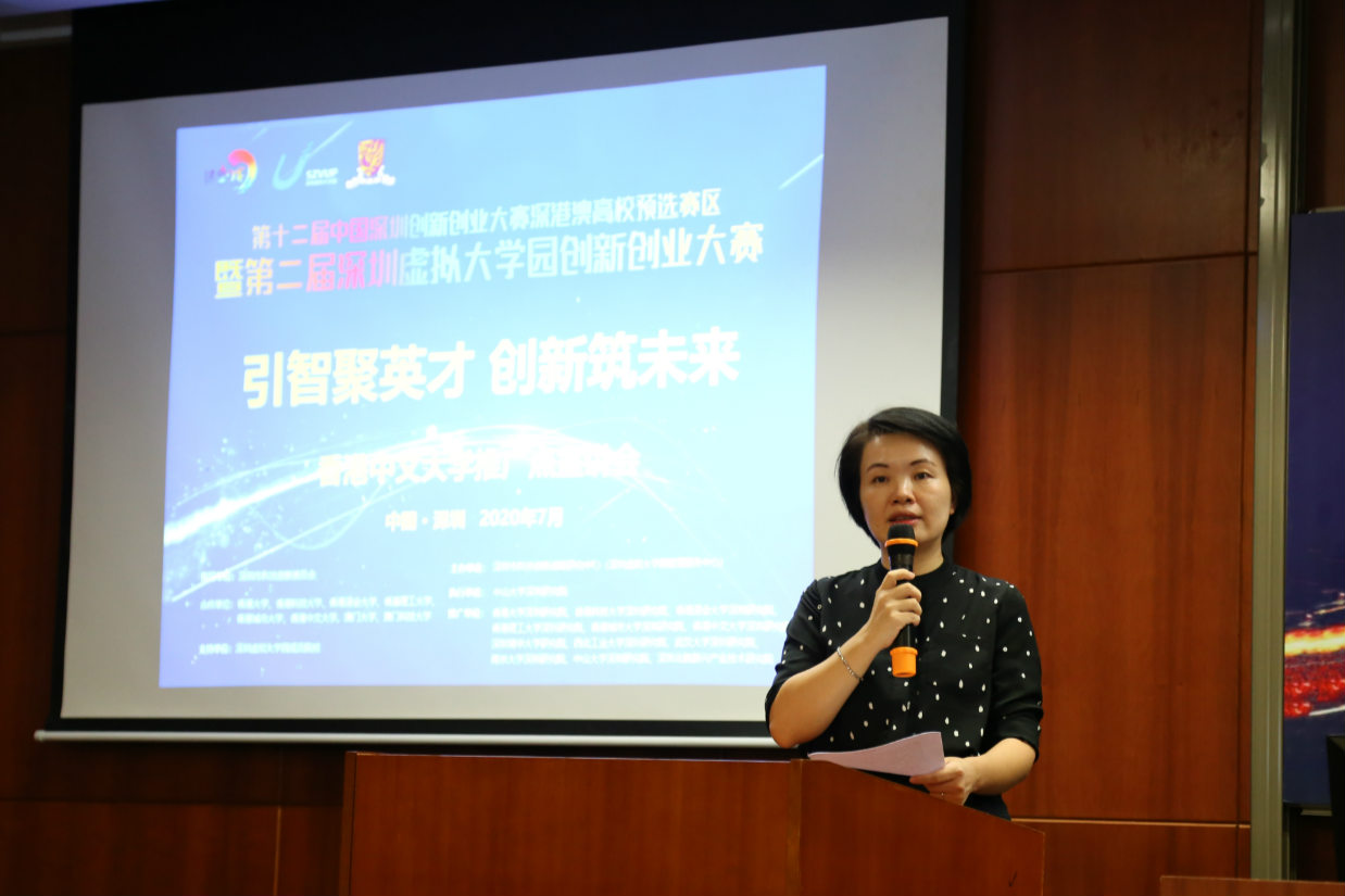 借此机会,也邀请到深圳市科技创新战略研究中心副主任陈蓉博士为创业团队和代表介绍了深圳虚拟大学园20年来的发展成果,并分享了主办深港澳高校预选赛的契机。陈主任也鼓励创业者把握深圳创新创业的独特优势,通过参加深港澳高校预选赛开启在深圳创业的第一步。