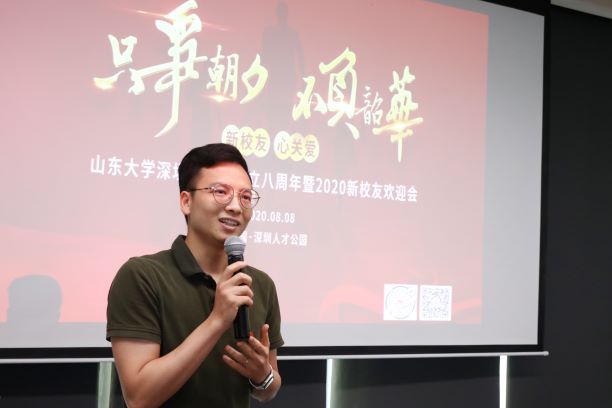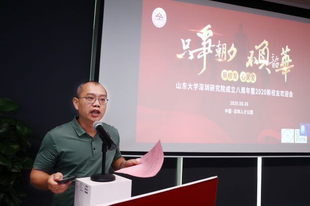 陈卓代表2020届新校友发言,他对学校、深圳研究院、校友会的各位领导和筹办此次新校友欢迎会的各位老师致以崇高的敬意和最衷心的感谢!他表示,从山东到广东,两千公里的距离,弥漫的是母校绵延不绝的关怀,深圳研究院为新校友架起了与母校沟通的桥梁,搭建了校友之间交流的平台,他倡议同学们积极参与活动,也希望各位校友能在今后的工作和生活中相互帮助,相互扶持,为母校山东大学添彩争光,祝福研究院越来越好!