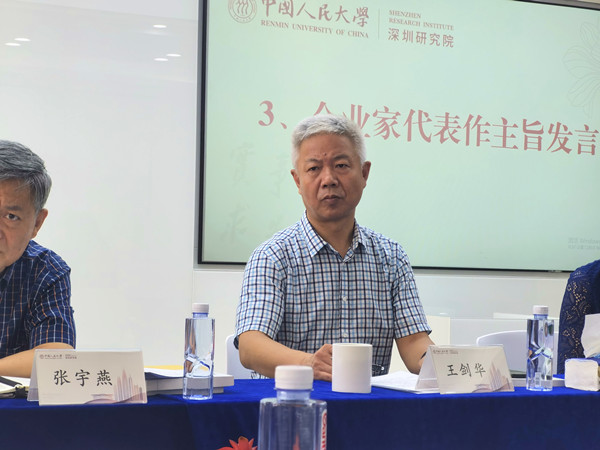 深圳市科技创新战略研究中心王剑华主任致欢迎辞。他对企业家座谈会的顺利召开表示祝贺,并对与会嘉宾的到来表示热烈欢迎。他高度赞扬了研究院一年多以来在人才培养、智库建设,产学研融合等方面为深圳做出的贡献,期待研究院未来能举办更多精品活动。