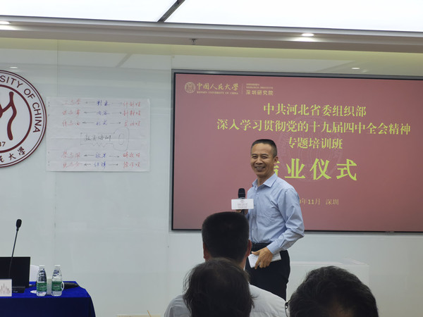11月9至14日,由中国人民大学深圳研究院(以下简称“研究院”)承办的中共河北省委组织部深入学习贯彻党的十九届四中全会精神专题培训班顺利举行。研究院常务副院长关雪凌教授、中共河北省委组织部公务员三处处长谷恩发出席开班仪式并致辞,来自河北省直部门干部处长,各市党委组织部、部分县党委组织部部长及有关处室负责同志近60人参加课程培训。