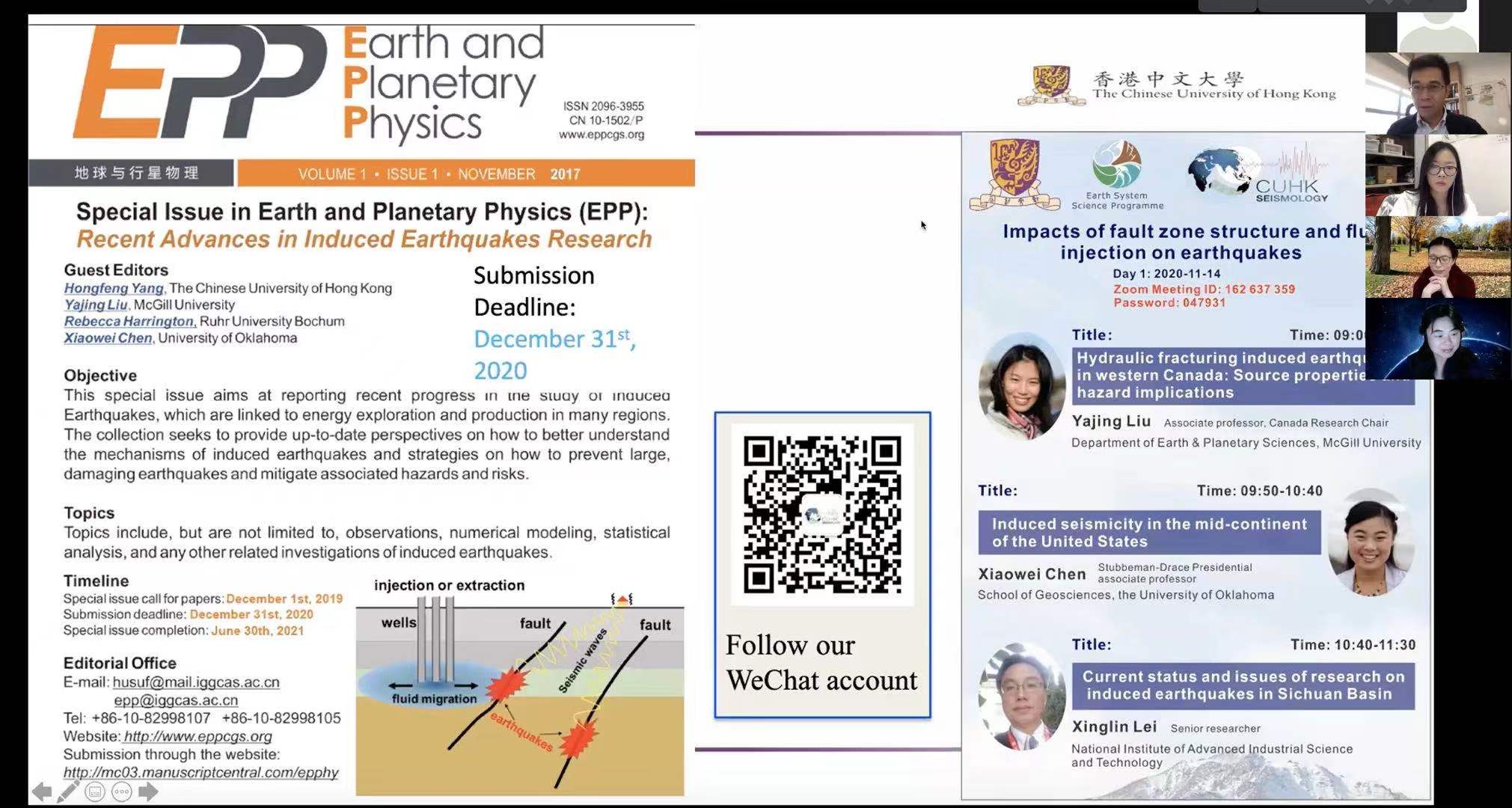 由香港中文大学深圳研究院和香港中文大学地球系统科学系杨宏峰教授课题组联合主办的线上学术研讨会早前圆满举行,会议以“Impacts of Fault Zone and Fluid Injection on Earthquakes”(流体注入与断裂带对地震的影响)为题,探讨油气开采诱发地震的前沿研究成果,吸引超过300名学者踊跃参加。