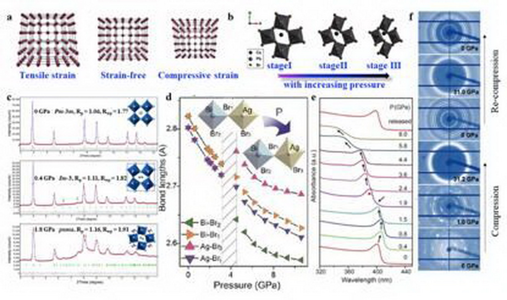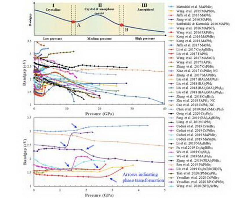 图3.通过X-射线衍射实验、同步辐射实验、紫外可见吸收、第一性原理、分子动力学模拟等等大量实验数据分析发现,钙钛矿中存在残余应力,在实验室条件下存在临界相变压力以及引起无定形结构转变超高压力。