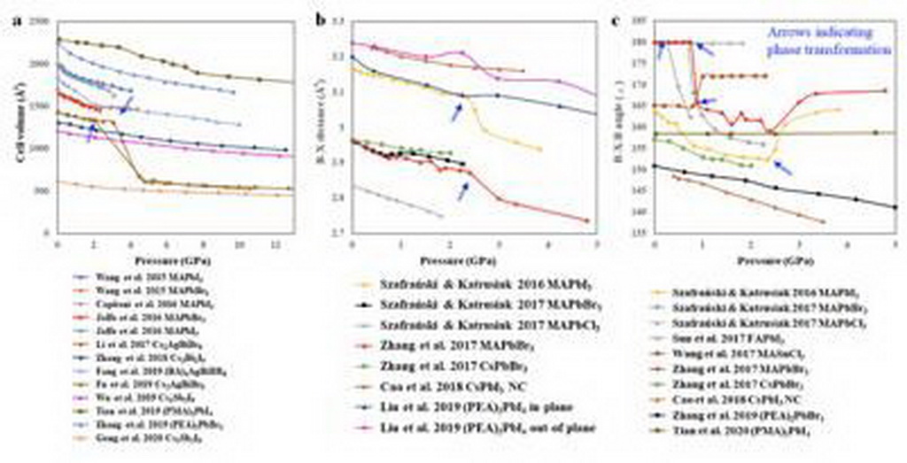 图5. 随着外界应力增大,在某一特定压力区间,发现钙钛矿中晶胞体积、金属-卤族键长、金属-卤族-金属键角,出现数值增大突变,随后减小趋势。