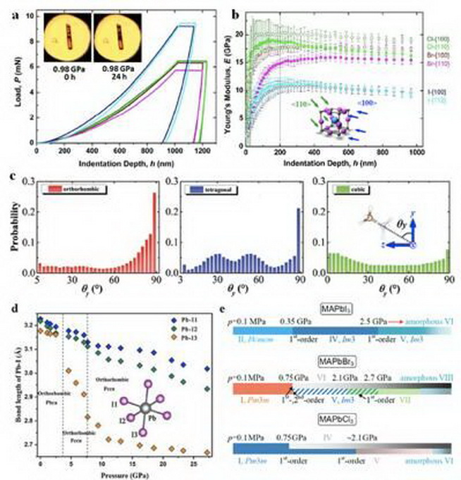图 7. 通过纳米压痕实验发现,钙钛矿室温下呈现塑性形变,且沿不同晶向方向施加压力出现蠕变;钙钛矿晶相改变,其A位有机阳离子与B-X面键角取向改变,立方晶相无显著择优取向;钙钛矿八面体中金属与不同卤族承受压力不同、超高压下出现非晶相。