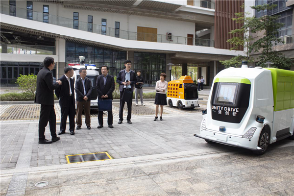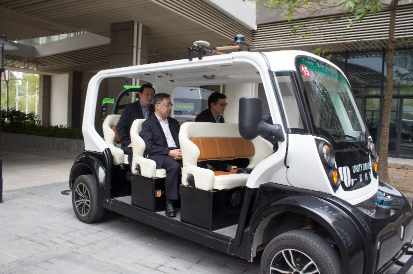 (调研组体验一清载人接驳无人车)