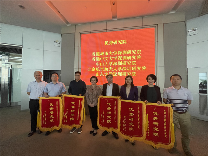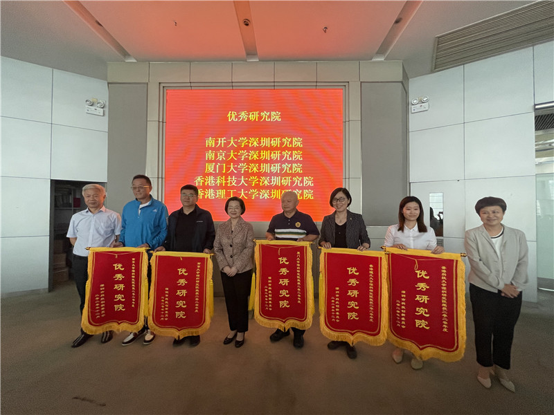 陈蓉副主任宣读了“深圳市科技创新委员会关于表彰2020年度深圳虚拟大学园优秀研究院和先进个人的通报”文件。15家研究院被评为优秀研究院,分别是深圳清华大学研究院、北京大学深圳研究院、深圳航天科技创新研究院、西北工业大学深圳研究院、武汉大学深圳研究院、南开大学深圳研究院、南京大学深圳研究院、厦门大学深圳研究院、香港科技大学深圳研究院、香港理工大学深圳研究院、香港城市大学深圳研究院、香港中文大学深圳研究院、中山大学深圳研究院、北京航空航天大学深圳研究院、山东大学深圳研究院。此外,还有143人次获得创赛组织奖、研发机构引进(建设)奖、科研项目申报组织奖、博士后引进奖、大型学术会议及论坛组织奖、人才培养奖等先进个人奖项。委领导邱宣分别为受表彰的先进单位颁奖。