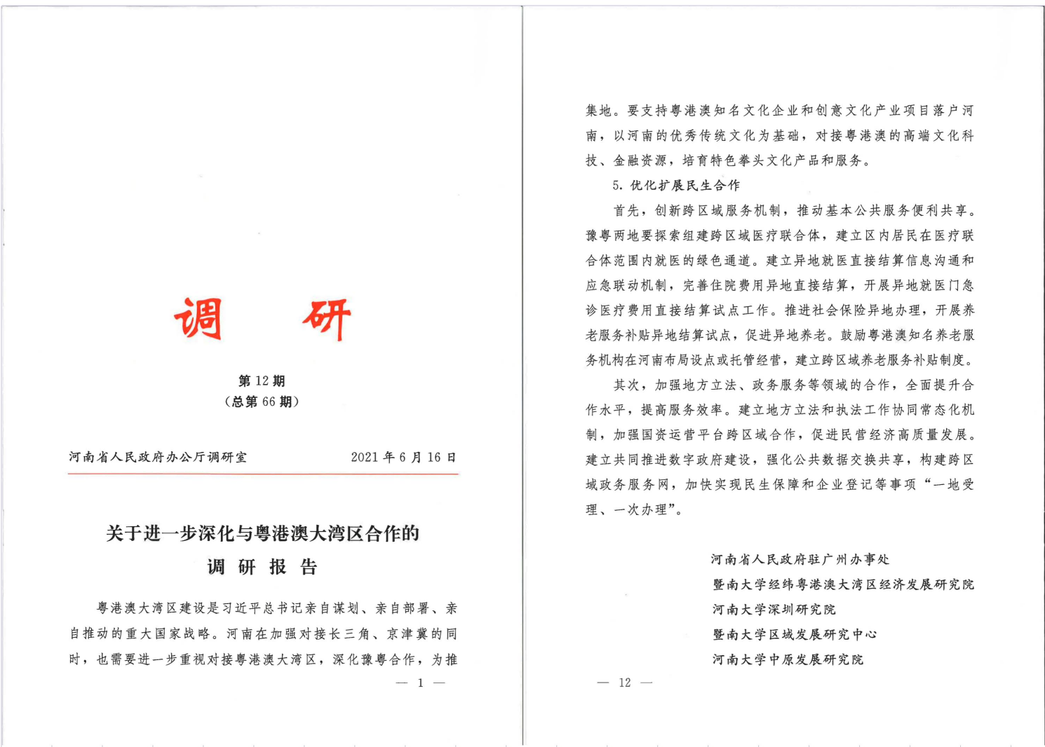 河南大学地方治理与经济发展研究中心是河南大学深圳研究院的二级研究机构,于2021年1月挂牌成立,很快引起相关部门的关注。3月份,研究中心主任宋丙涛教授团队和深圳研究院特聘研究员、暨南大学覃成林教授团队应邀参与了河南省驻粤办事处委托的课题研究。经过近四个月的座谈走访与调查研究,形成两万多字的调研报告《关于对接粤港澳大湾区,深化豫粤合作的建议》,报告得到河南省驻粤办事处的高度认可,并被提交到河南省人民政府办公厅。办公厅高度重视该研究成果,指示研究团队压缩篇幅后在办公厅内刊《调研》,以《关于进一步深化与粤港澳大湾区合作的调研报告》专题刊登,并送至各省长及其他相关领导参阅。该报告从深化豫粤合作的重要意义、合作基础与潜力、合作重点领域三个方面,详细论述了如何为现代化河南建设注入新动力、拓展新空间、增强在新发展格局中的战略支撑作用,为河南省委省政府战略决策提供了重要支撑和参考。
