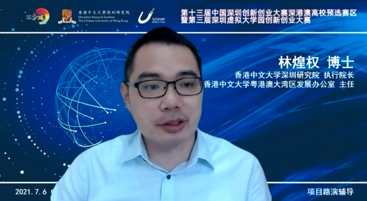 7月6日,香港中文大学深圳研究院组织第十三届中国深圳创新创业大赛(深创赛)深港澳高校预选赛区暨第三届深圳虚拟大学园创新创业大赛首场赛事辅导会,邀请深圳市科技服务业协会副会长牛多佳和创业导师曹强作为辅导嘉宾,围绕“深创赛商业计划书撰写要点及路演技巧”和“如何快速实现成果转化”进行主题分享。