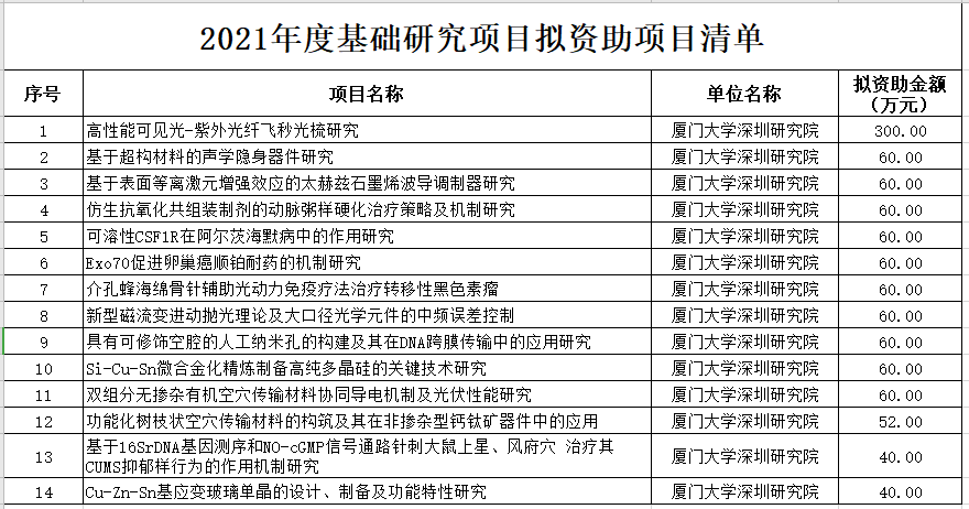 厦门大学深圳研究院获1032万元深圳市2021年度基础研究项目资助