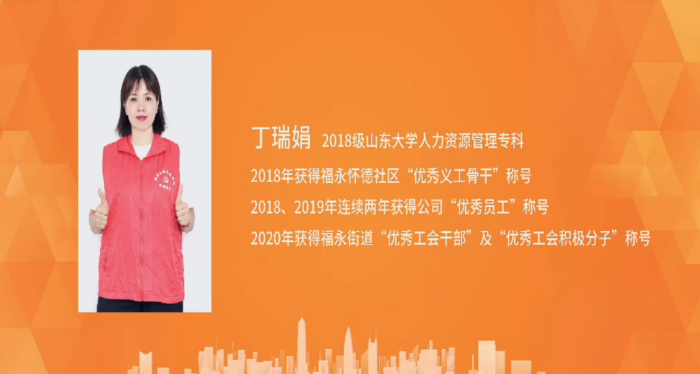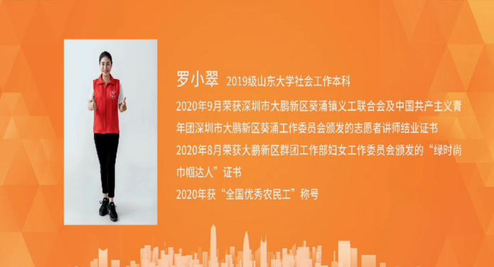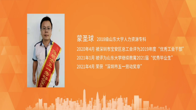 今年是山东大学连续第九年助推深圳市总工会的“圆梦计划”项目,帮扶学生500余人。典礼上共表彰了八位“2021年度圆梦之星”,其中蒙圣球、丁瑞娟和罗小翠三位均来自山东大学。
