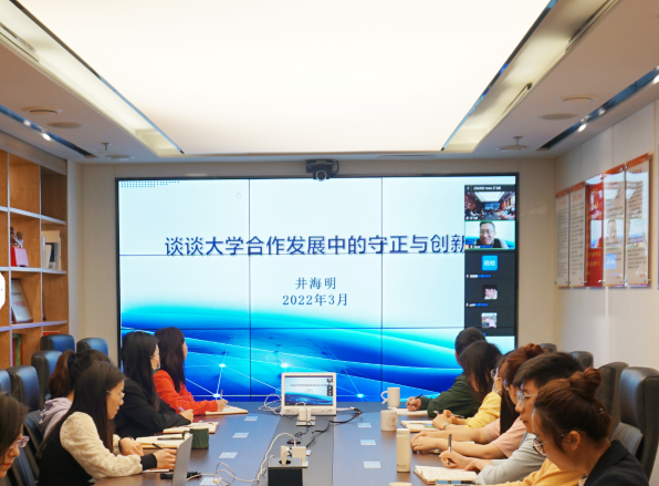 为着力提高研究院全体中层干部和职工履职能力,加强研究院人才和队伍建设,研究院特邀山东大学原服务山东办公室主任井海明教授为全体员工开展内部培训。井海明围绕高校社会服务的主题,精心准备了题为《谈谈高校合作发展中的守正与创新》的在线讲座,讲座由研究院常务副院长王明星主持,全体中层干部和员工参加学习。