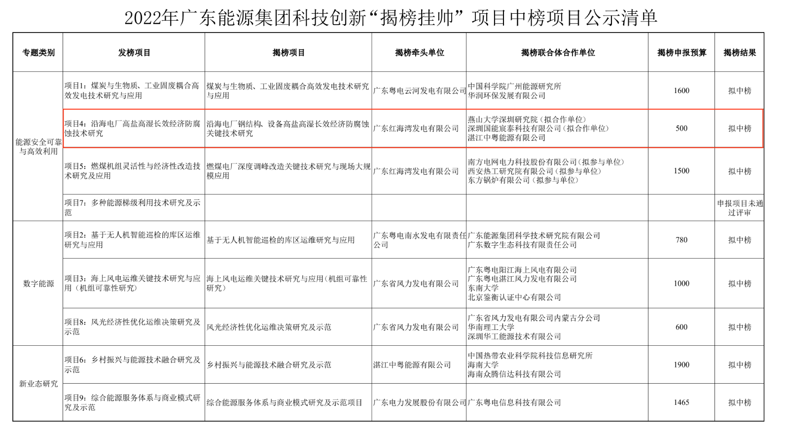 近日,广东省能源集团有限公司公布了“2022年广东能源集团科技创新“揭榜挂帅”项目中榜项目公示清单”,燕山大学深圳研究院(以下简称“深研院”)与广东红海湾发电有限公司、深圳国能宸泰科技有限公司、湛江中粤能源有限公司组建的院企联合体成功中榜“沿海电厂钢结构、设备高盐高湿长效经济防腐蚀关键技术研究”项目,揭榜申报预算500万,这也是深研院积极服务粤港澳大湾区海洋产业的一次突破性尝试。