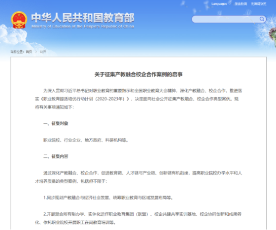 附:教育部于2021年7月28日发布《关于征集产教融合校企合作案例的启事》