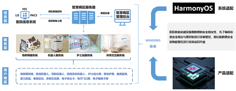 除此之外,合盛科技还创新性的对现有产品进行全国产化的技术升级,针对目前较为主流的海思芯片、鸿蒙系统、欧拉服务器,结合UNITY开发技术,对现有智能化病区多系统进行兼容性开发,以便更好的发挥国产系统的物联特性优势与信息安全优势,为医院提供更为安全稳定、功能多元的服务选择。