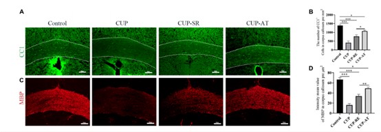 最后他们对相关机制进行了研究,发现饲喂元宝枫油不但可以促进大脑中少突胶质细胞(形成髓鞘的细胞)的再生,而且能够抑制CUP引起的星形胶质细胞和小胶质细胞激活导致的神经炎症,从而有利于神经纤维髓鞘的再生和修复。