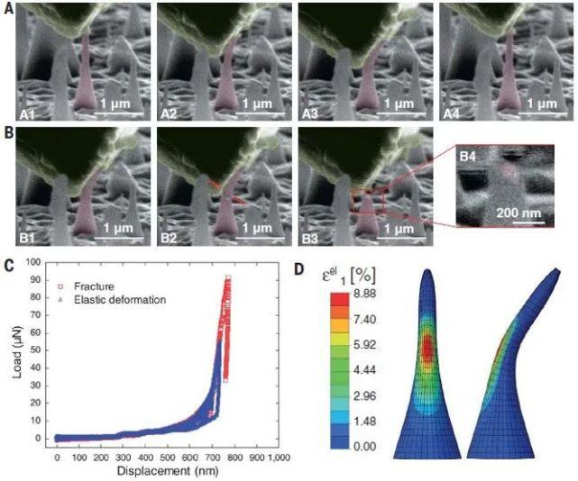 在早前单晶金刚石纳米针中实现的超大弹性变形(来源:Lu*, et al. Science, 2018)