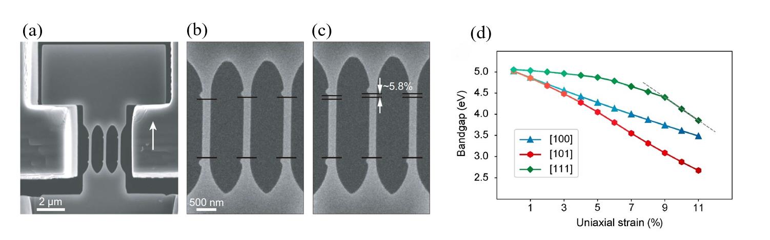(a)- (c)应变金刚石器件阵列,(d)沿不同方向不同应变值下,金刚石禁带宽度变化的第一性原理预测 (来源Lu Y.*, et al. Science, 2021)