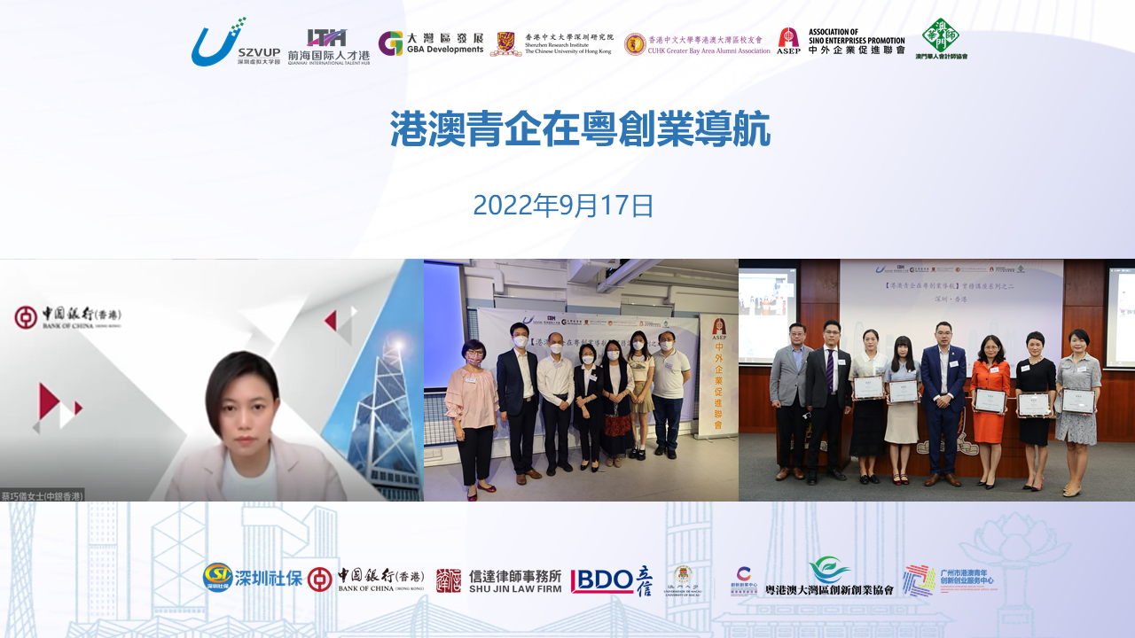 为落实《国家发展改革委办公厅关于进一步做好社会资本投融资合作对接有关工作的通知》(发改办投资〔2022〕233号), 9月17日,「港澳青企在粤创业导航」实务系列讲座圆满举行。本场讲座由深圳市科技创新战略研究和技术转移促进中心主办,香港中文大学粤港澳大湾区发展办公室联合前海国际人才港、香港中文大学深圳研究院、香港中文大学粤港澳大湾区校友会、中外企业促进联会及澳门华人会计师协会,围绕港澳青年进入湾区创业、就业过程中的政策支持、金融跨境融通等内容进行分享。活动于深圳和香港两地通过线上及实体方式举办,吸引超过500人次参与。通过嘉宾的分享和讲解,为港澳地区的项目和资金来“架桥梁、搭平台、拓渠道”,推动港澳项目尽快落地湾区。