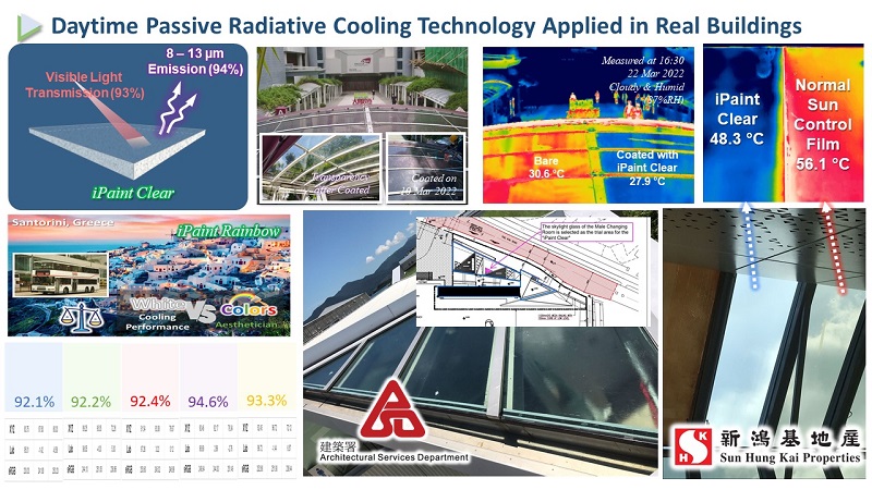 “无电制冷涂层使用在建筑物表面时,可以使室内温度降低6至8摄氏度,预计至少可以节省40%的冷气耗电量”,朱毅豪博士介绍到,团队在香港东涌创新中心的天台已经实际测试过无电制冷涂层的制冷效果。