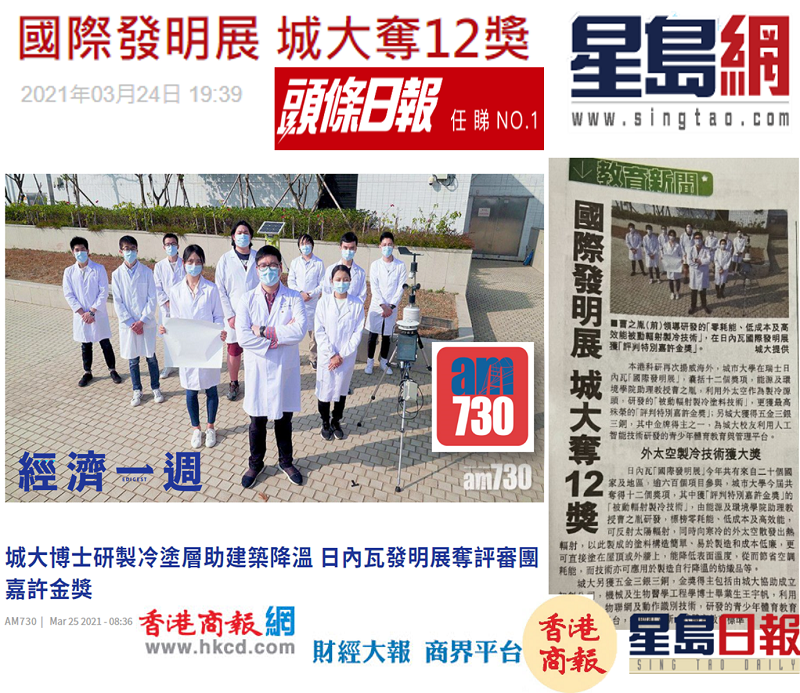 在曹博士带领下,团队最初以这种独特的制冷技术,于2021年初参加日内瓦国际发明展,成功获得评审团特别嘉许金奖。之后香港城大宣布了HK Tech 300这个计划,曹博士和团队经讨论后认为将技术转化“落地”极具意义,于是决定由朱毅豪等博士生和研究助理牵头创立“创冷科技”,并通过参与HK Tech 300计划获得了10万港元种子基金。截止目前,由曹之胤博士带领下,进行不断的试点测试、参与比赛,并在今年获得100万的天使投资基金。